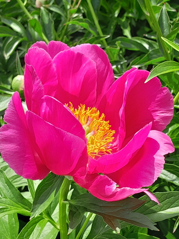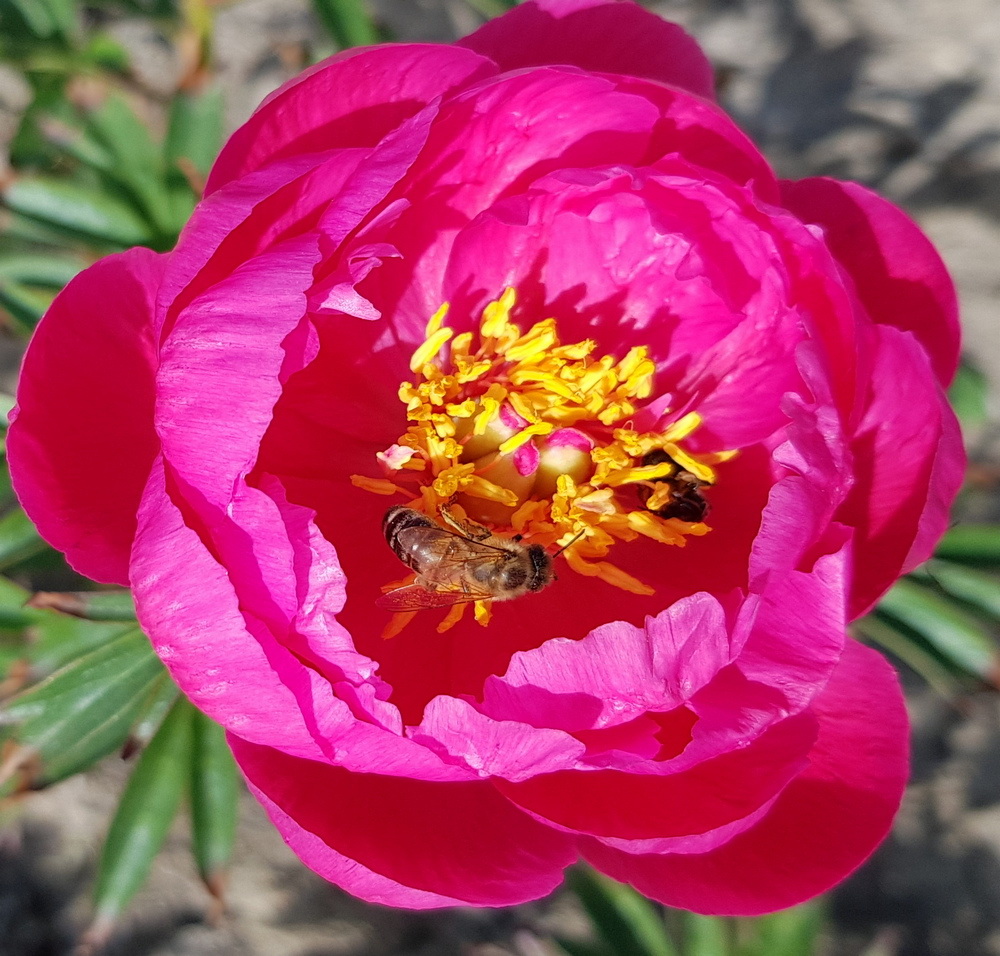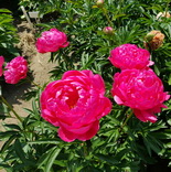Патио-пион, для выращивания в контейнерах, для маленьких садиков. Цветок мелкий, карминно-красный, при вечернем освещении с лиловым оттенком, края лепестков светлее. Махровый, лепестки чередуются с жёлтыми тычинками. Обильное цветение. 60см. EM