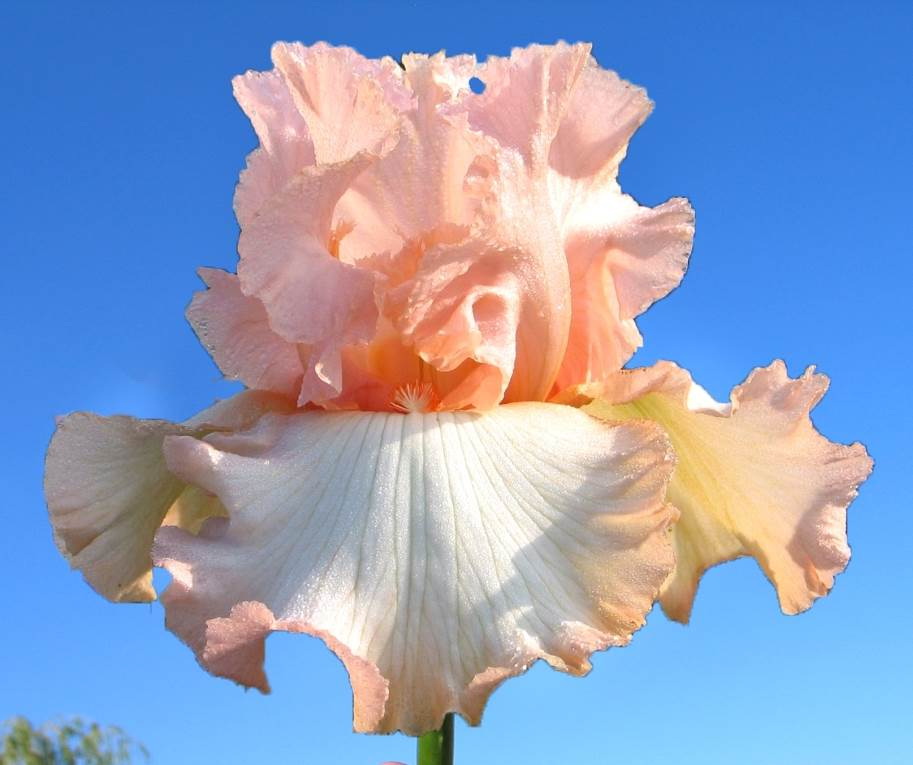 CHEAP FRILLS Black’09. 38” EL. HM’11 AM’15 Сильно гофрированная и кружевная контрастная пликата с тёмно-жёлто-персиковыми пестиками, высовывающимися из светло-жёлто-персиковых S. Белые F сильно кружевные и омыты корица-персиковым «песком» и окаймлением пликаты в основаниях. Красно-оранжевые В разделяют зеленоватые полоски, расширяющиеся к низу на ? F. Сильный здоровый рост, выставочный цветонос. 3-4 ветви, 10-11 цветков. Barry Blyth считает, что такой ирис в Австралии принимают как дорогого гостя. Даёт особенные сеянцы в широком спектре цветов и узоров. Decadence x (Secret Admirer x Chiffon Ruffles). |