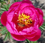 Патио-пион, для выращивания в контейнерах, для маленьких садиков. Цветок мелкий, карминно-красный, при вечернем освещении с лиловым оттенком, края лепестков светлее. Махровый, лепестки чередуются с жёлтыми тычинками. Обильное цветение. 60см. EM