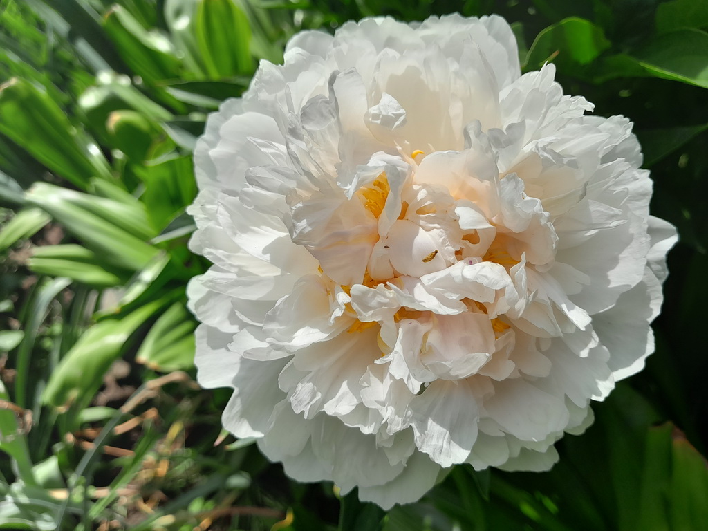 Цветок махровый корончатый. Снежно-белый, на нижних лепестках возможны пурпурные мазки. Верхние лепестки уже нижних, перемежаются с тёмно-жёлтыми тычинками. Лёгкий приятный аромат. Листья светло-зелёные, блестящие, черешки листьев и цветоносы с антоциановыми пигментами. Здоровый сорт с хорошей силой роста. 70-80см. M (Другие названия Snowy Mountain, Gold Dusted, Золотой Вождь)
